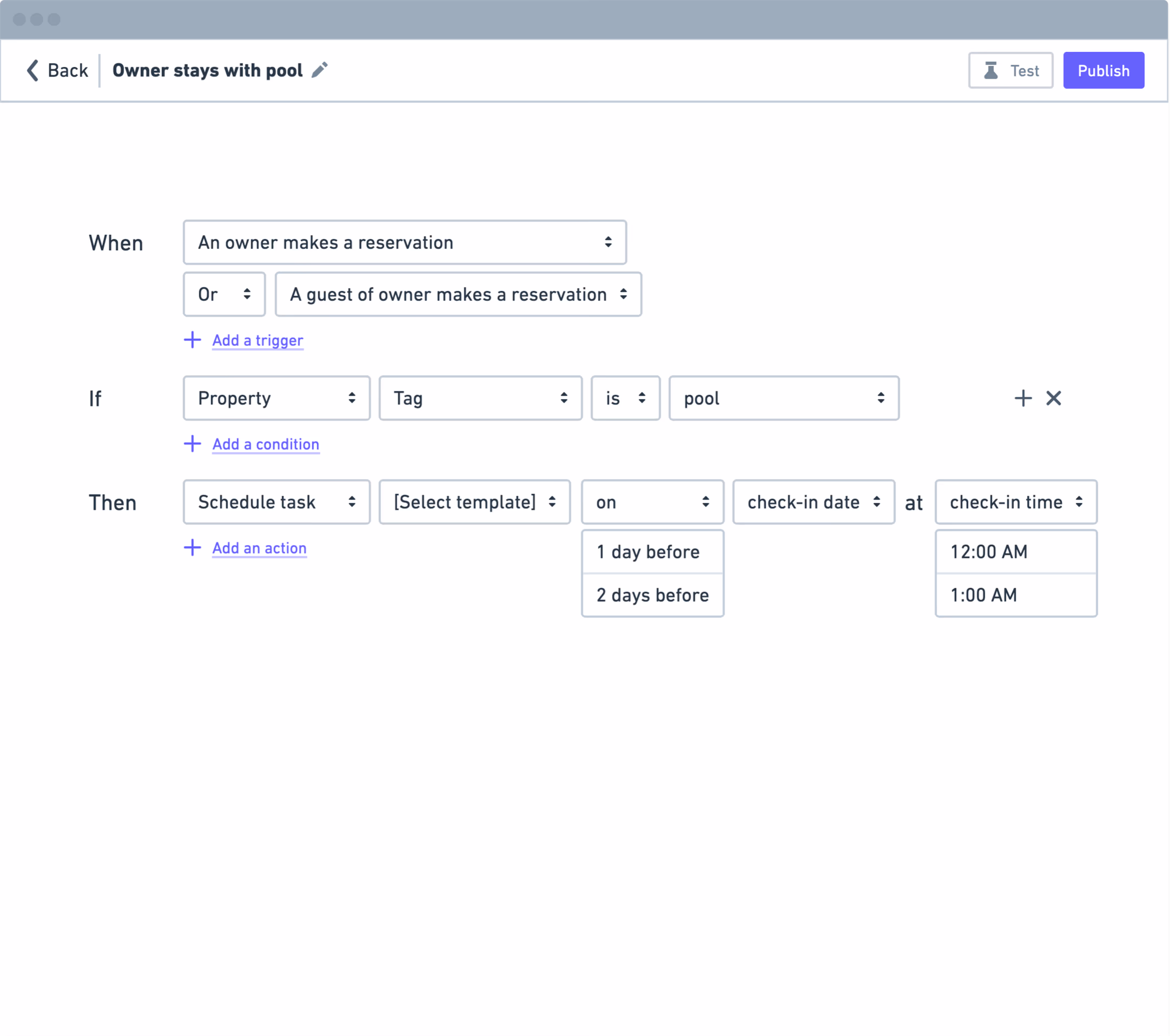 Users could add multiple action nodes and multiple task templates to each action. Day offsets let users schedule tasks relative to reservation events. Instead of only scheduling a task "on check-in," they could now set tasks for "3 days before check-in" or "2 days after checkout." This gave users precise control over task timing.