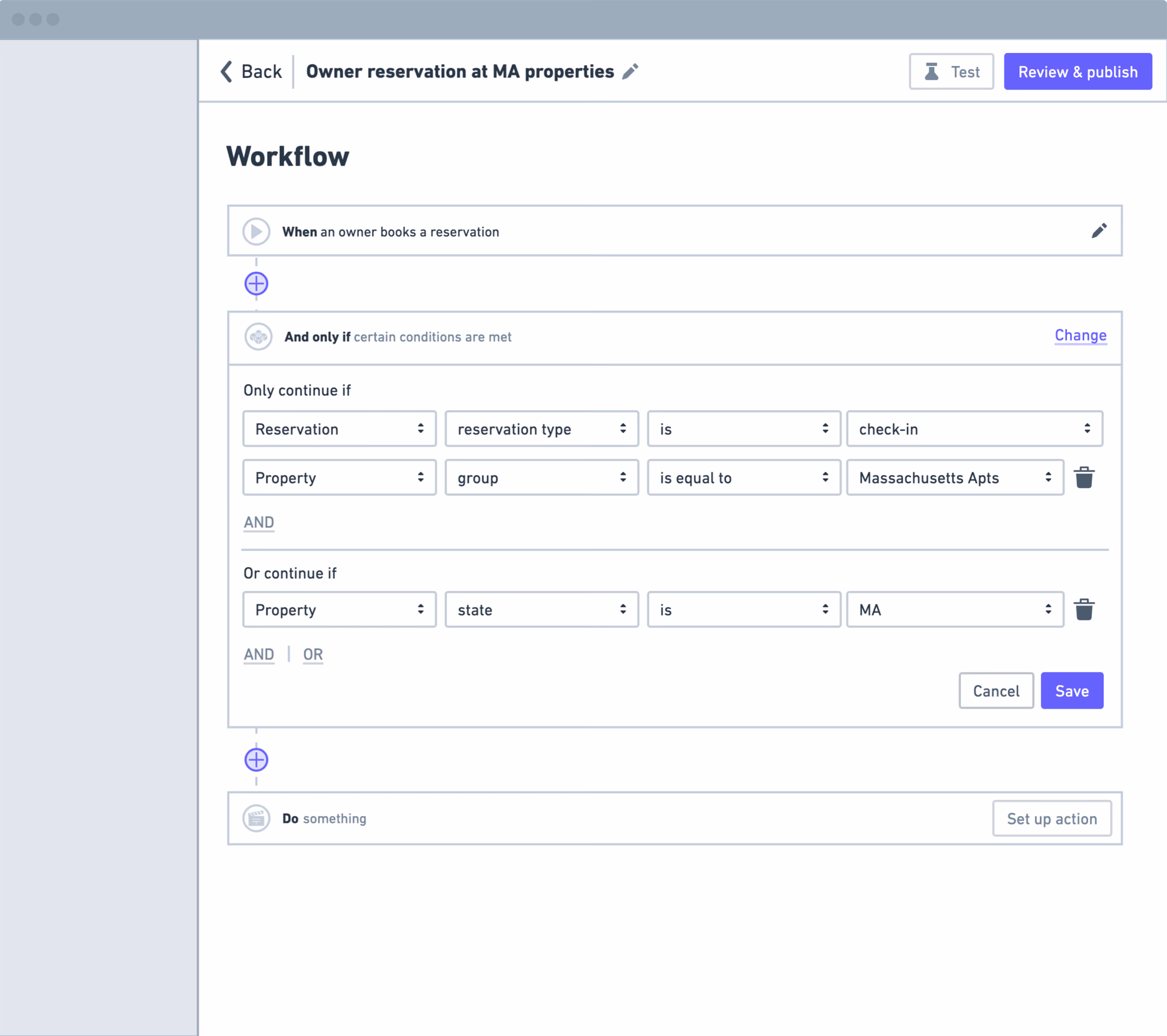 Example: A property manager creates a workflow for owner stays at waterfront properties.