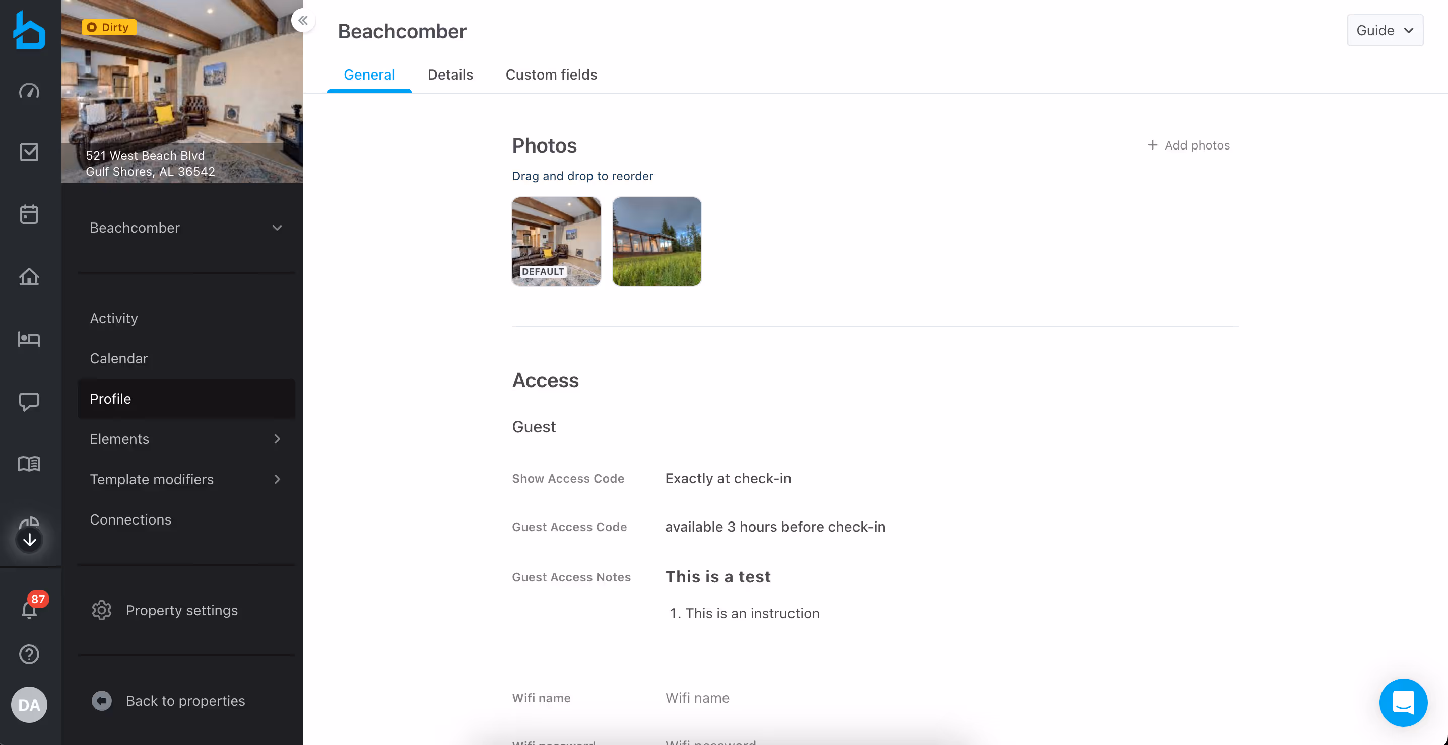 Caption: Clicking on a property name from the Schedule brought users to the Property Details page. This particular page under Profile > General is where property managers could add photos of the property, guest access details, etc.