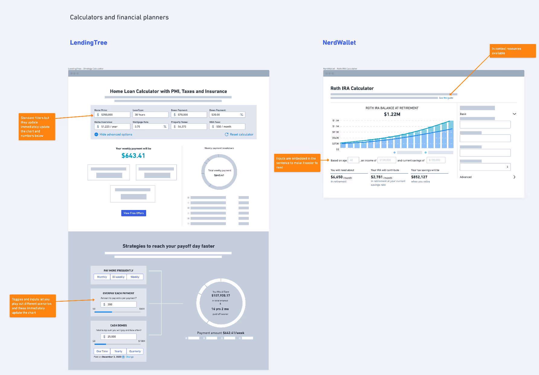 I then presented stripped down wireframes of comparative analytics dashboards and financial calculators that made complex information seem easier to understand.