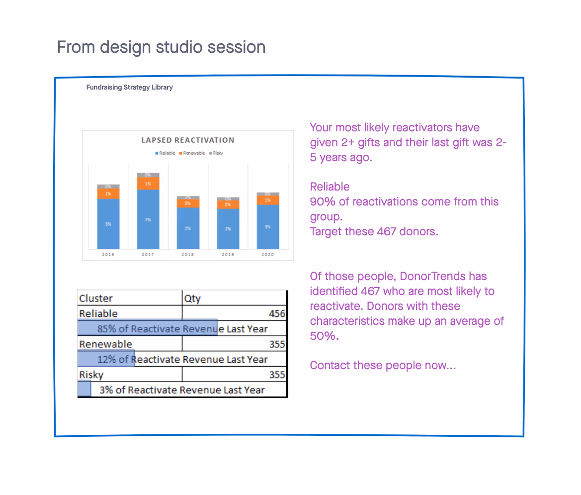 We dove deep with the DonorTrends team to understand their predictive models. The analytics were incredibly valuable, but trapped in an unscalable delivery model.