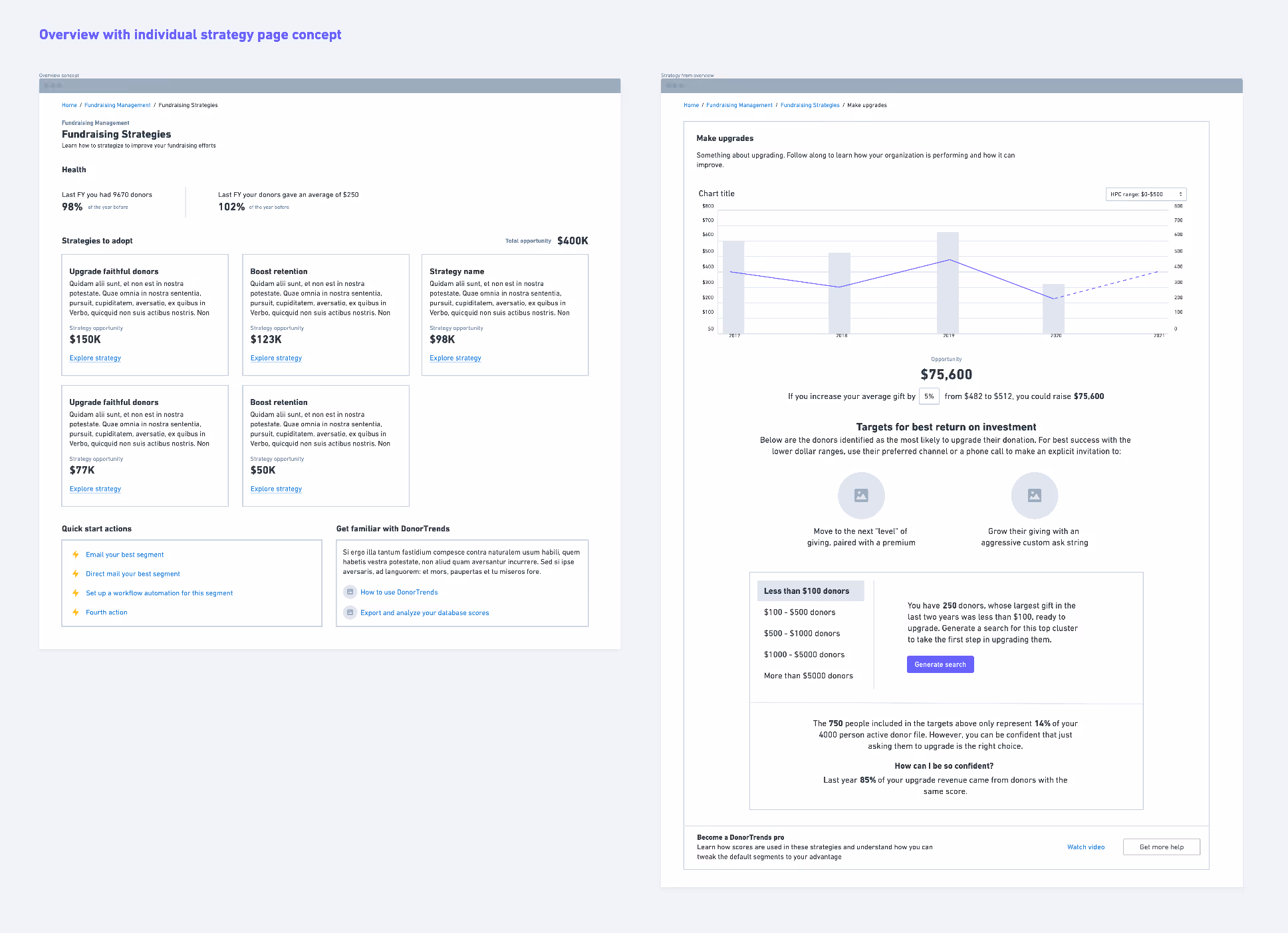 My first wireframes explored a modal where users would pick their goal (like "reactivate lapsed donors") and only see relevant charts for that choice. It felt focused but quickly proved too restrictive since switching goals meant starting the whole process over.