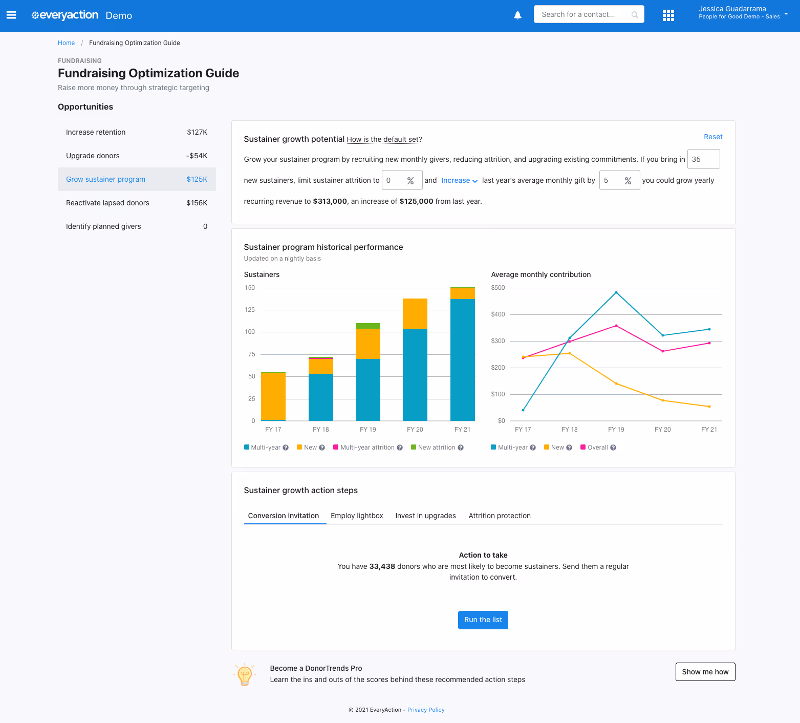 Interactive demos let DonorTrends prospects explore real ROI calculations themselves, leading to prepared sales calls using their actual NGP VAN data.