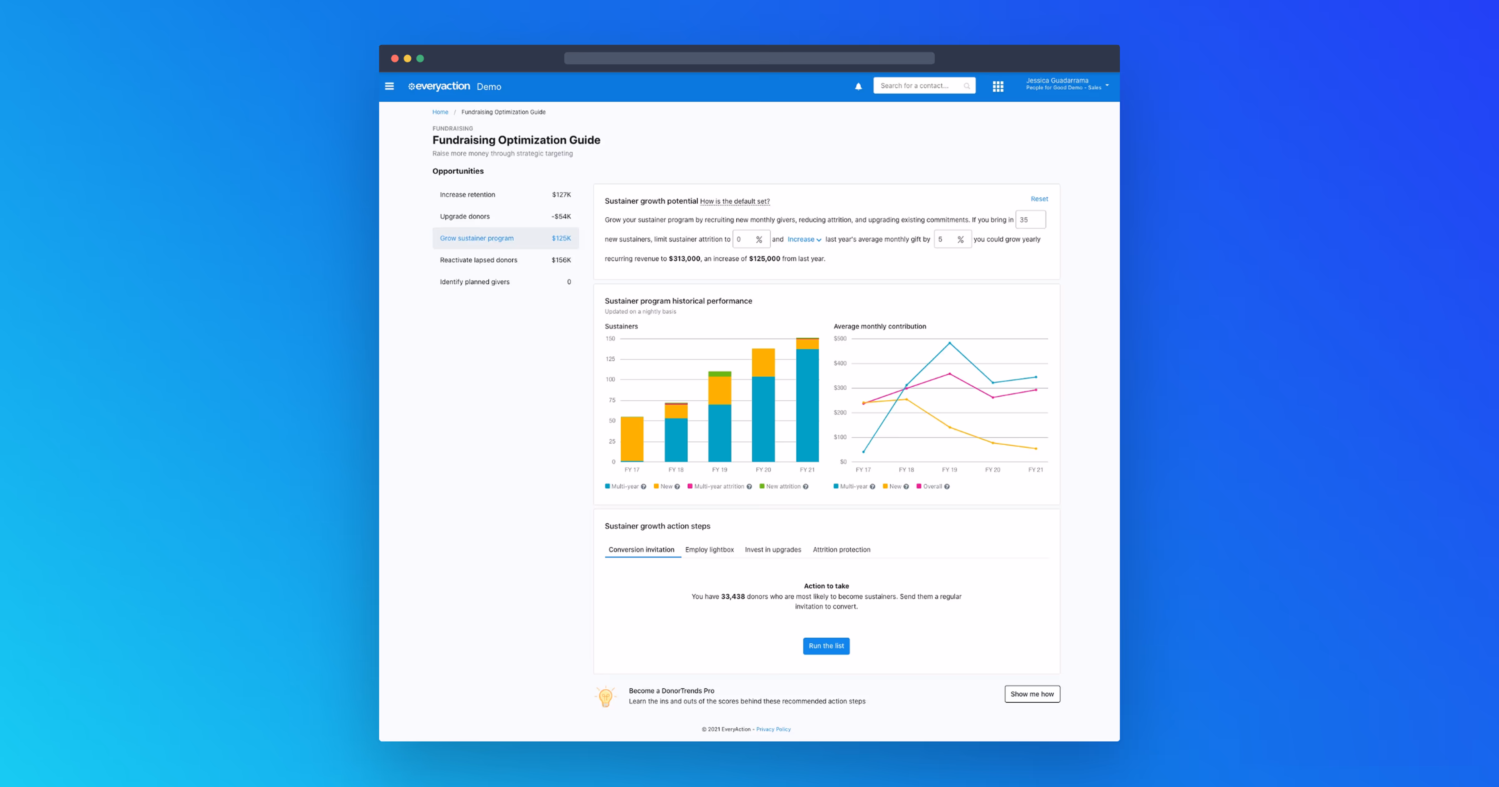 After testing and refining, here's what we landed on: clean calculations, clear recommendations, and those high-dollar insights surfaced exactly where fundraisers needed them.